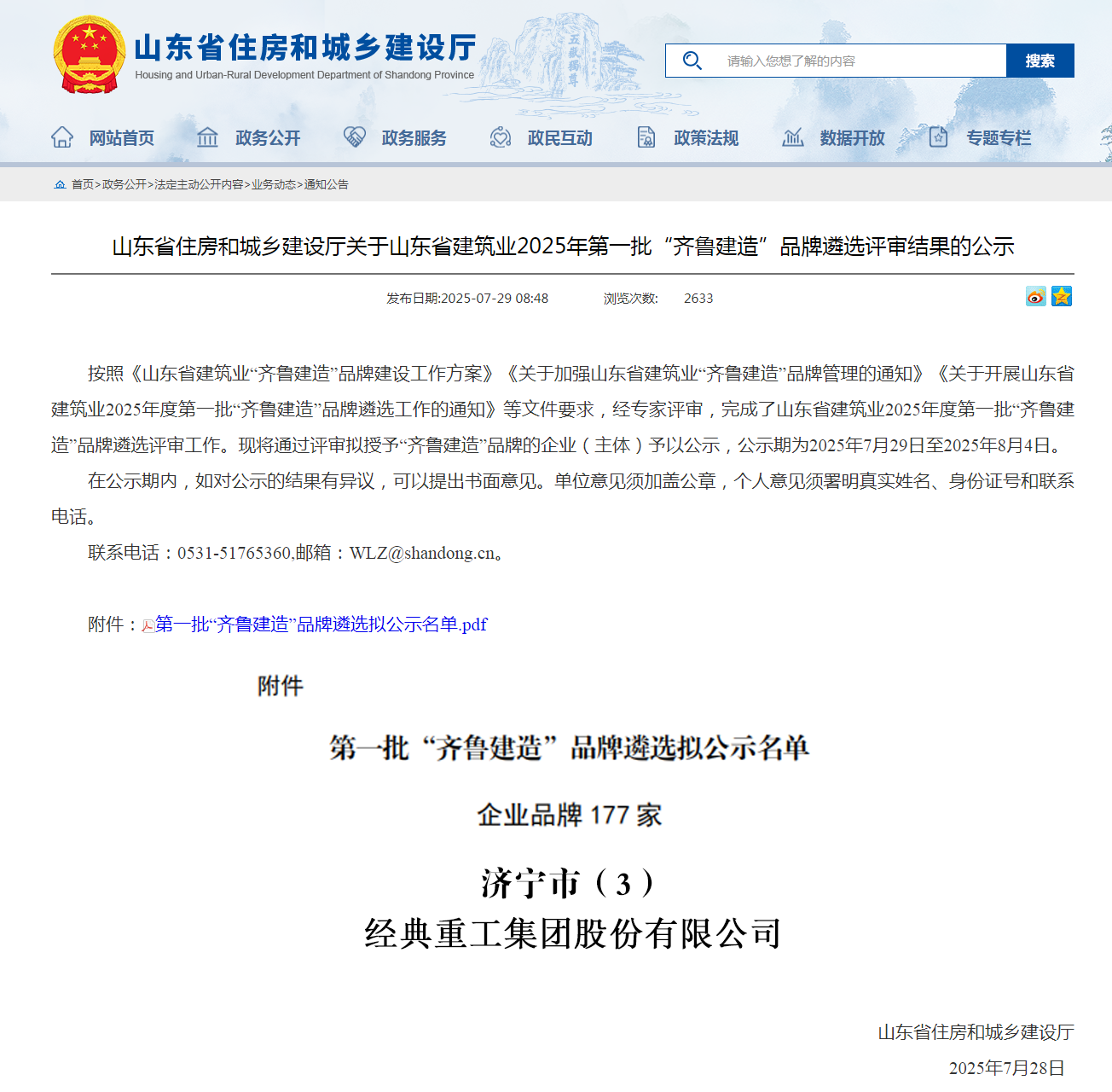 近日,山東省住房和城鄉(xiāng)建設(shè)廳正式公布2025年第一批“齊魯建造”品牌遴選名單,經(jīng)典重工集團股份有限公司憑借在鋼結(jié)構(gòu)建筑部品建材領(lǐng)域的技術(shù)實力與品牌影響力,成功入選部品建材品牌名錄,這標志著公司在推動建筑產(chǎn)業(yè)現(xiàn)代化、智能化、綠色化發(fā)展方面的綜合實力又獲省級權(quán)威認可。2025-08-06